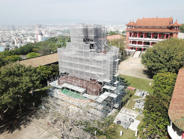 Changhua Mt. Bagua’s Great Buddha is seated cross-legged above a lotus-shaped base that measures 16 meters in diameter and 4 meters in height. The entire statue is made of reinforced concrete. The Great Buddha is approx. 22 meters in height (including the lotus-shaped base) and the base is roughly 694 square meters in area. It has been 61 years since its completion. The Buddha's body has many cracks and damages and needs to be repaired. In order to overcome the uneven structure of the Buddha body, Sucoot’s facade scaffolding is adopted in this restoration project. Its features are easy assembly and disassembly with high safety and good stability. Also, it can be designed according to the shape change. |