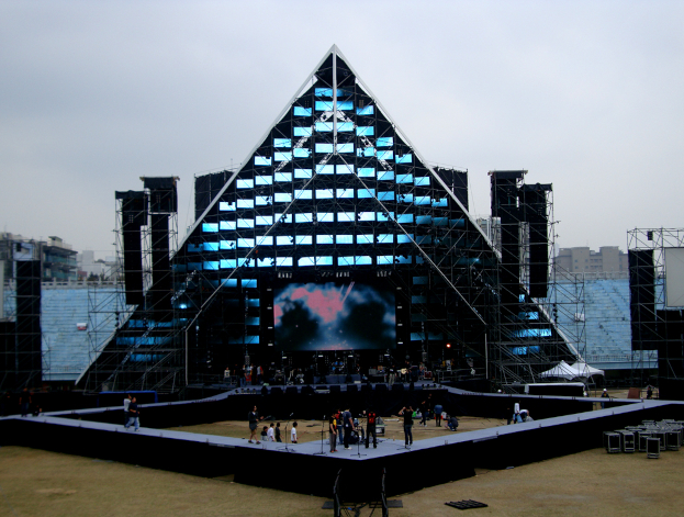 The pyramid stage measured 52.9 meters wide and 26 meters high, featuring 154 central LED panels surrounded by 312 color screens, and included two equilateral triangular extended platforms projecting into the audience area. The unique structure required precise structural analysis by professional engineers using computer simulation to ensure stability and safety.