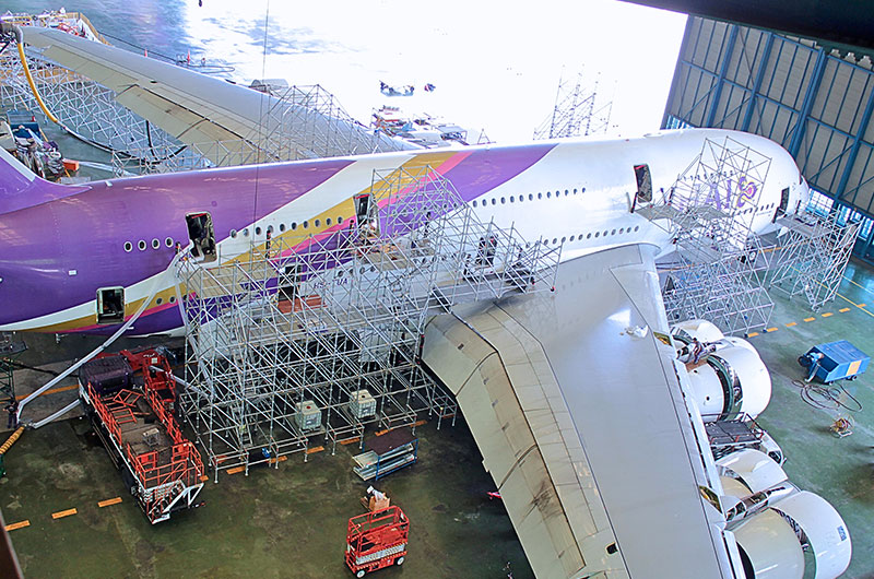 Built with precision-engineered connections that meet international safety standards, Sucoot scaffolding provides rock-solid stability. Technicians can work at height safely, with platforms designed to stay clear of the fuselage while allowing close access.