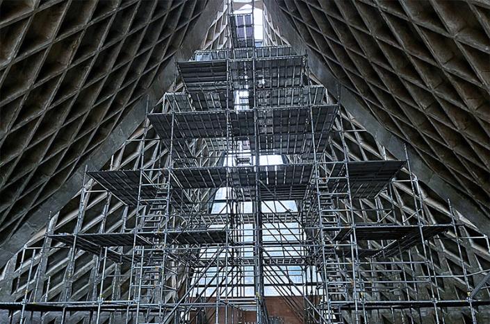 Made of high-strength steel with precision ring connections, provides a secure platform without harming the structure — proven in projects like the Luce Memorial Chapel.