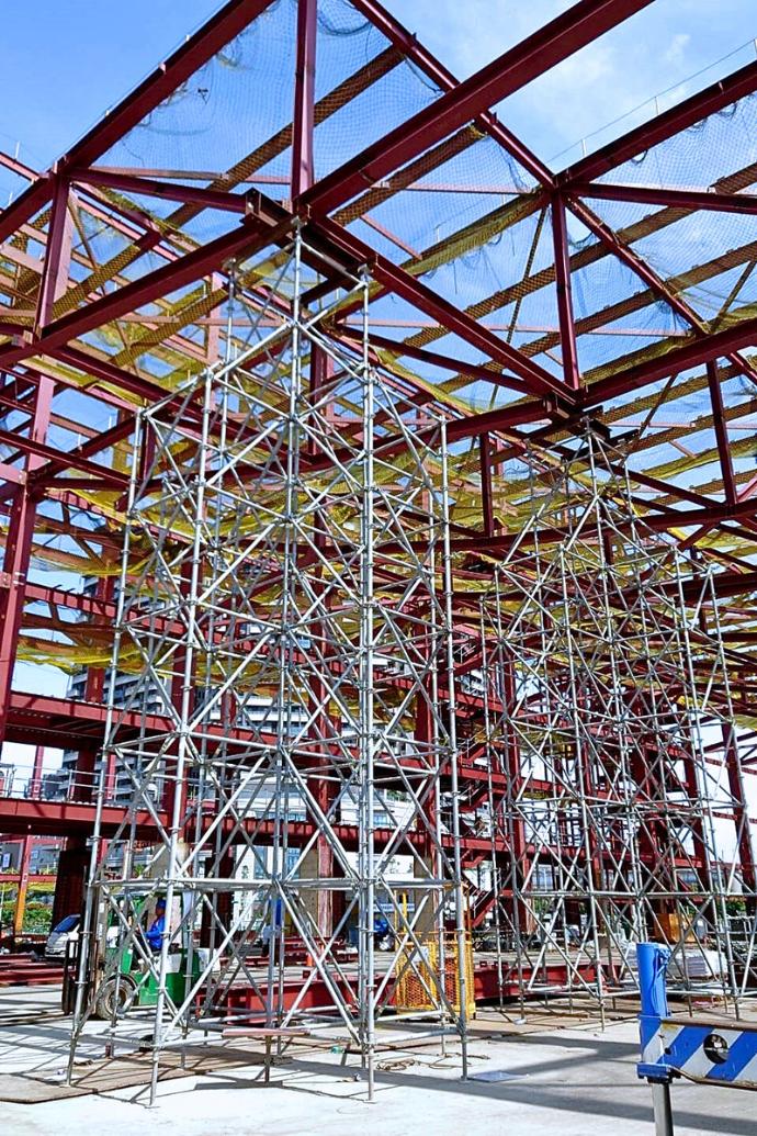 The Sucoot Ring Lock System can be configured with different lengths of horizontals, diagonals, and suspended brackets to create work platforms that safely bring workers close to the building’s surface.
