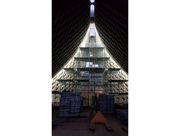 - The central area of the scaffolding must be designed with an open space to preserve the passageway and maintain internal traffic flow during construction.
