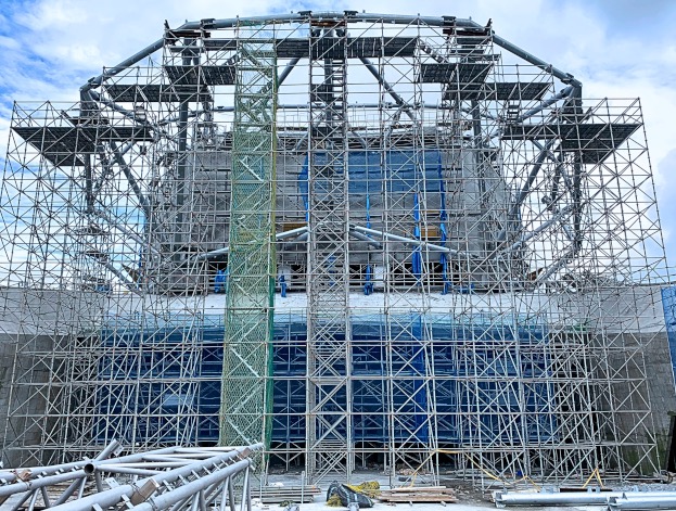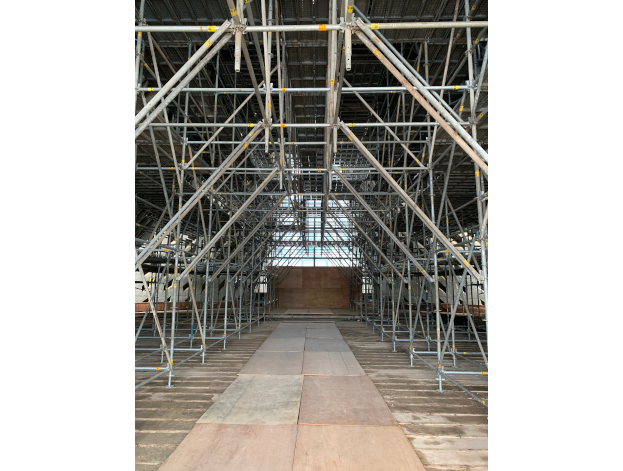 - The total height of the scaffolding is approximately 20 meters. It must be positioned close to the curved inner walls, patio, and floor-to-ceiling lighting glass of the front and rear doors, without touching the chapel’s main structure.