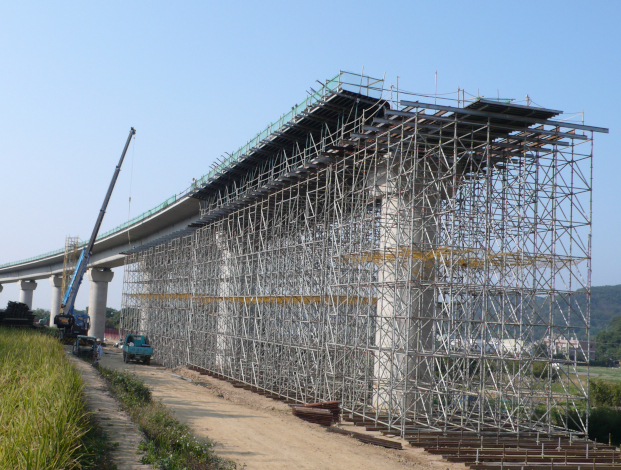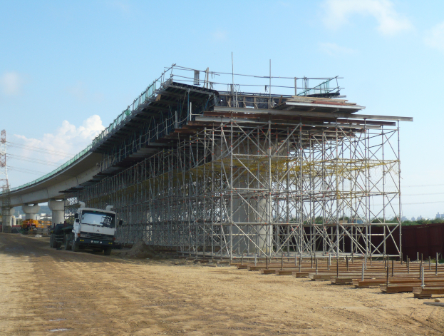 Description :In the Taoyuan Airport MRT CE02 section, Sucoot’s Ring Lock Scaffolding System was applied to support large bridge spans with exceptional efficiency and safety. The system allowed entire shoring towers to be lifted and relocated as a whole, eliminating repetitive dismantling and reassembly. Using only 10 sets of materials and a 7-person crew, the contractor successfully completed 300 spans in two years — on schedule, on quality, and with zero safety incidents.