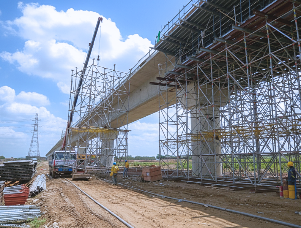 實固高強度、高精度的圓盤系統®鷹架,可因應各種高空作業與臨時支撐需求,廣泛應用於橋梁工程、石化廠、飛機維修等產業,即使在不平整地形、曲面結構、不規則或懸伸挑空結構中,亦能提供安全且可靠的作業與支撐解決方案。