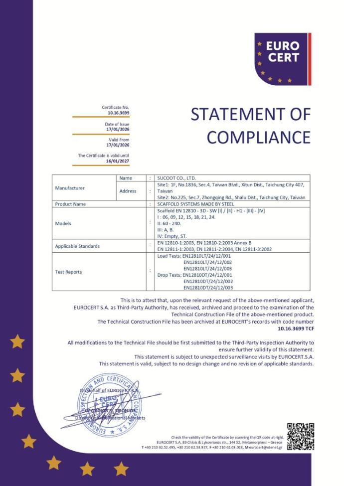 台灣首家且唯一獲得 EN-12810-1 認證的公司。